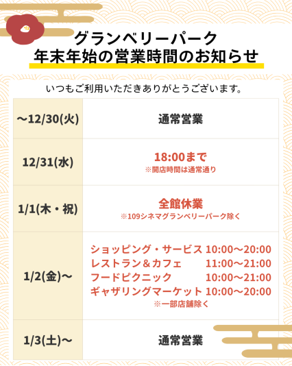 ※1月1日(元日)は109シネマズグランベリーパーク、各社ATMのみ営業となります。