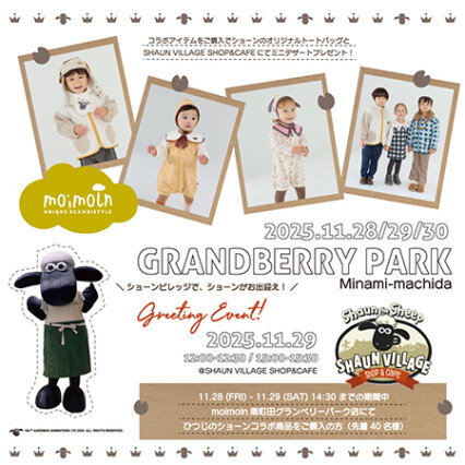 ■内容:2025年11月28日(金)OPEN~2025年11月29日(土) 14:30 までの期間中、南町田グランベリーパーク店にて「ひつじのショーン X moimoln 」コラボ商品をご購入の方へ、先着でグリーティング参加券を配布いたします。