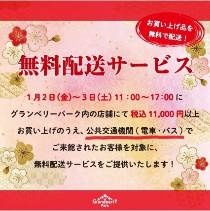 グランベリーパークで税込11,000円以上お買い上げのうえ、公共交通機関(電車・バス)でご来館されたお客さまを対象に、商品無料配送サービスをご提供いたします。