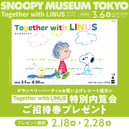 スヌーピーミュージアムの新企画展「Together with LINUS」を記念して、3/6(金)の特別内覧会ご招待券を先着でプレゼントいたします!🎁 ✨