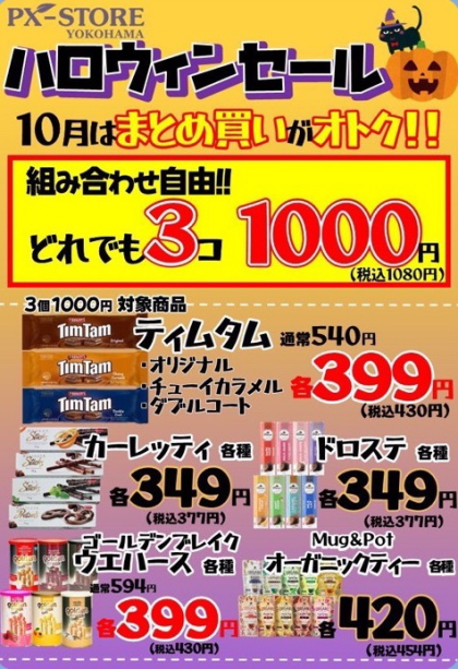 PXストアで、たいへんおトクな 🎃ハロウィンセール開催中です‼️ 対象商品が、組み合わせ自由3個で、 税込1,080円! おまとめ買いのチャンスです。 ご来店お待ちしております🤗